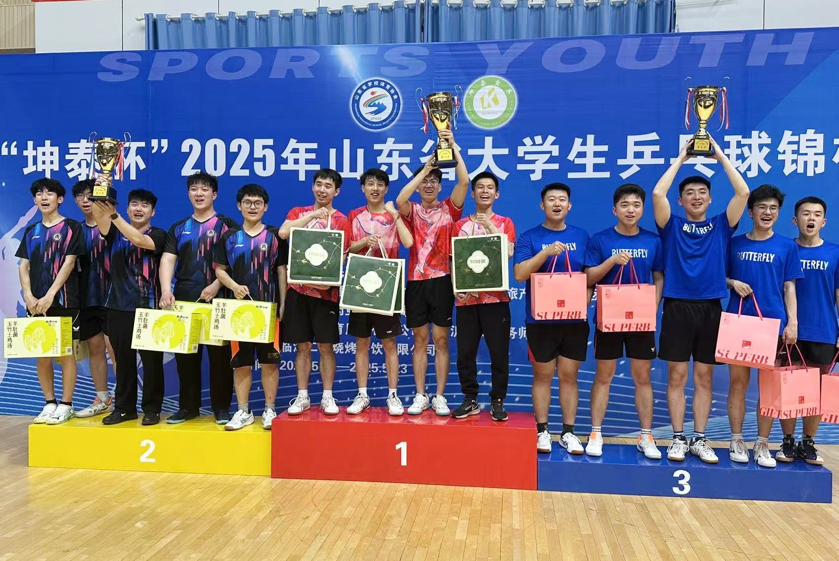 【本站讯】5月23日,2025年山东省大学生乒乓球锦标赛在临沂圆满结束。我校体育教学部派出翁炀晖、高千里、张帆三位乒乓球教练,分别率领阳光乒乓球队(甲组)和高水平乒乓球队(丙组)参赛。经过六天紧张激烈的角逐,我校获得2金5银4铜,创造了校乒乓球队历史最好成绩,并荣获团体总分一等奖,高千里、张帆、翁炀晖获评山东省“优秀教练员”称号。