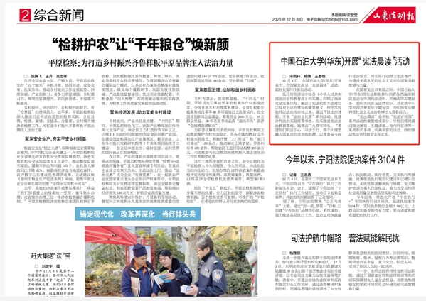 为全面贯彻党的二十大和二十届四中全会精神,深入学习宣传贯彻习近平法治思想、习近平文化思想和习近平总书记关于宪法的重要论述,加强宪法法治宣传教育,在第十二个国家宪法日暨宪法宣传周期间,中国石油大学(华东)成功开展“宪法宣传周”系列活动。活动由法治办公室,党委学生工作部、武装部和团委主办,文法学院承办,涵盖校内校外联动、线上线下结合的多元方式,兼具理论深度与实践广度,让尊法学法守法用法在师生之间蔚然成风,为建设法治校园注入青春活力。活动获山东青年报、山东法制报等多家主流媒体报道。